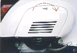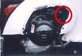| まず、エンジン・フラップを外す。レバーを矢印方向に回すと外れる。 | 赤印の部分にプラグが付いている。プラグに、キャップが被っているので外す。 | 基Dを使って、プラグを外す。左回転に回すと緩む。 基Dで最初緩めてから後半は指で回す。ネジ山の場所を感覚で覚えよう。 |