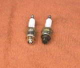 右は、真っ黒にカーボンが付着している。カーボンでなく、ビショビショに濡れている時もある。カーボンが付いている時は、混合比が濃いか、オイルが多いか、マフラー詰まり等である。 ビショビショになっている時は、エンジン始動がへたくそで被ったか、アイドリングで被るか等が考えられる。 ひとまず交換して様子を見よう。大きなトラブルでなきゃ、これで解消される。 |