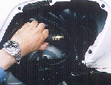 赤印の位置に外したと同じようにプラグを取り付けよう。その時、初めは指で回して行く。指でこれ以上回らなくなったら、基Dを使用する。締める回転方向は、右回転だ。