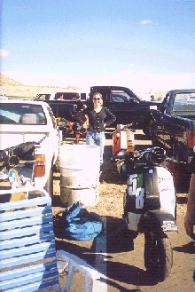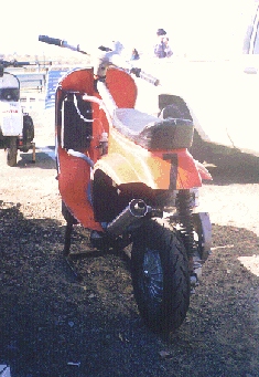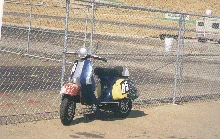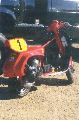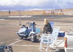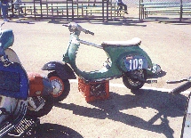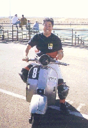 予選が始まり、初めてベスパに乗った。NSRのチャンバー付みたいな排気音だ。1速に入れてアクセル開けると前輪がフ〜ッと浮き始め、2速でさらに浮いてくる。すごいトルクだ。全開にするのがコワイくらいだ。1コーナー抜けて2コーナー目でひざをガリガリすって、立ち上がりのアクセル全開、スゲー加速でビビる。後輪が流れっぱなし、TT90GPでもだめか?!