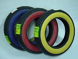 カラーリボンタイヤ 3.00-10 青、赤、黄あり ホワイトリボンならぬカラーリボンタイヤ。ぜーったいほかではおいていないと思う品。 SAWAというメーカーのものだが、ホワイトではないところが当社流。 4800円 |