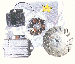 50S/100用・12Vキット 6Vのベスパを12Vに変更するキット ハロゲン球はもちろん、タコ・メーターだって使える。 バックプレートは、PK50を使用・レギュレーター/ブレーキSW/IGコイルがセットになっている。