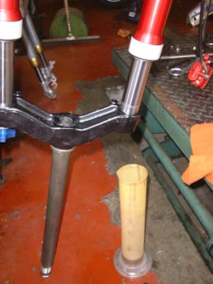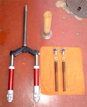 フォークの中身。 オレンジ色のウエスの上にある物が中身だ。なくさない様に注意。 今回は、オイルの粘度を5Wに変更した。 オイル量は左右同量の100cc。きちんと計量してから入れること。 後は外した要領で組み立てる。注意として、始めに外した青い部品が付いている物を取り付ける際、手で押し付けて、さらに手で締めてから工具を使うこと。 最初から工具で締め始めると斜めに入って、ネジを壊してしまう。 |