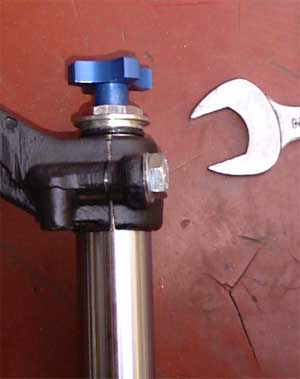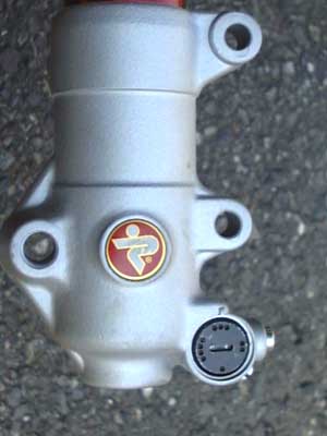 最後に右下にある黒いダイヤルで油圧を調整する。 1〜4段階に調整可能。合せ位置は、フォーク本体にデッパリがある。場所はダイヤル上部に付いている。 オイルの流れる穴の大きさを変える事によって油圧を調整している。 オイルを抜いた状態で、調整ダイヤルの所に付いている−のボルトを外してみよう。調整用の穴が見えるでしょ。 又、青いスプリングプレッシャーも締めこみながら調整しよう。 メーカーでは基準値の設定が無いので、お好みで油圧/バネレートを調整しよう。 |