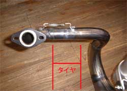 重要な点として、つなぎ目の問題。今までのマフラーの多くはタイヤの上でつないでいる為、排気漏れの油がタイヤに付いてしまう。 つなぎ目をタイヤに当らないように設計した。 これでタイヤが保護され、グリップ低下が防げる。 |
