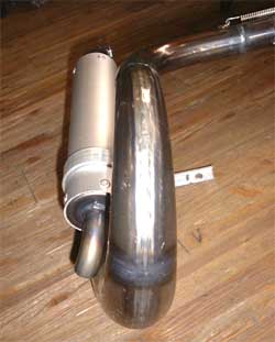 チャンバーは左出し。取り付けすると、排気口が少し下に傾いたようになる。ベスパに乗ったときサスが沈む、沈んだ位置を基準として製作にかかった。 溶接部分はほとんど溶接棒を使用していない。パイプの合わせ目が0.3mm以内にすり合わせして、アルゴン溶接する。 溶接後は叩いて膨らみを取り、磨きをかける。すべて手仕事 |